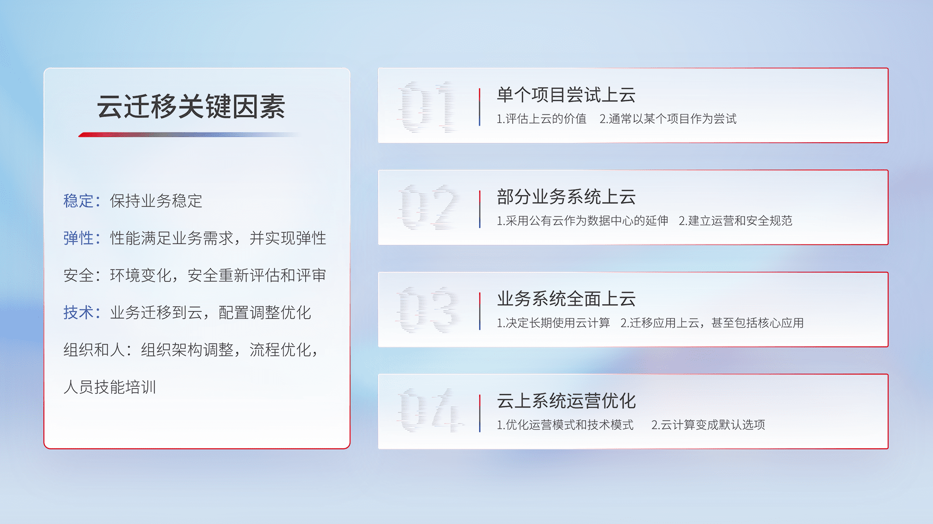 结合实际业务,,从规划设计、、、、云平台选型、、云原生改造、、、、数据迁移、、集成交付,,迁移全过程为客户识别最佳上云路径,,,做好风险识别管理,,设计网络架构、、、、身份权限、、、安全审计合规、、、、操作审计、、、、日志审计、、、监控告警策略、、多站点容灾设计等,,,对云上基础设施进行整体规划,,,提升IT治理水平,,,以满足弹性、、、高可用、、高性能的需求。。。