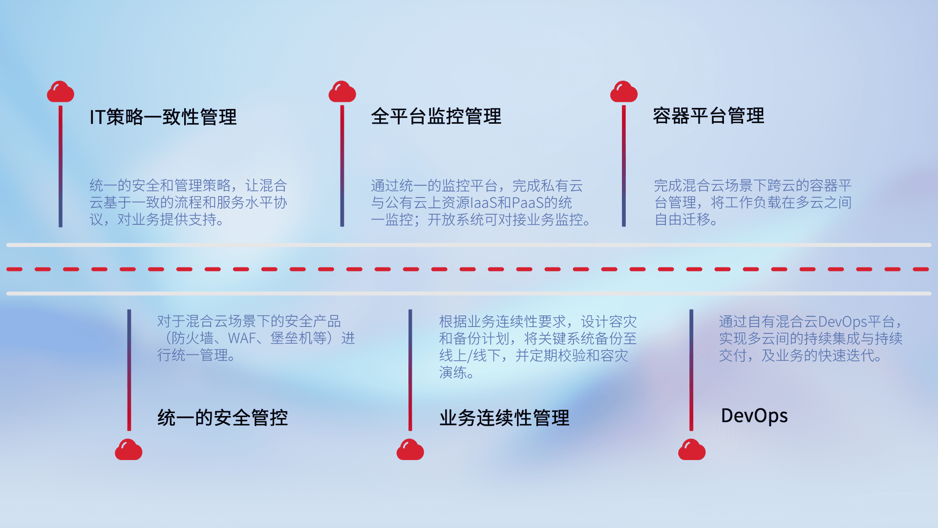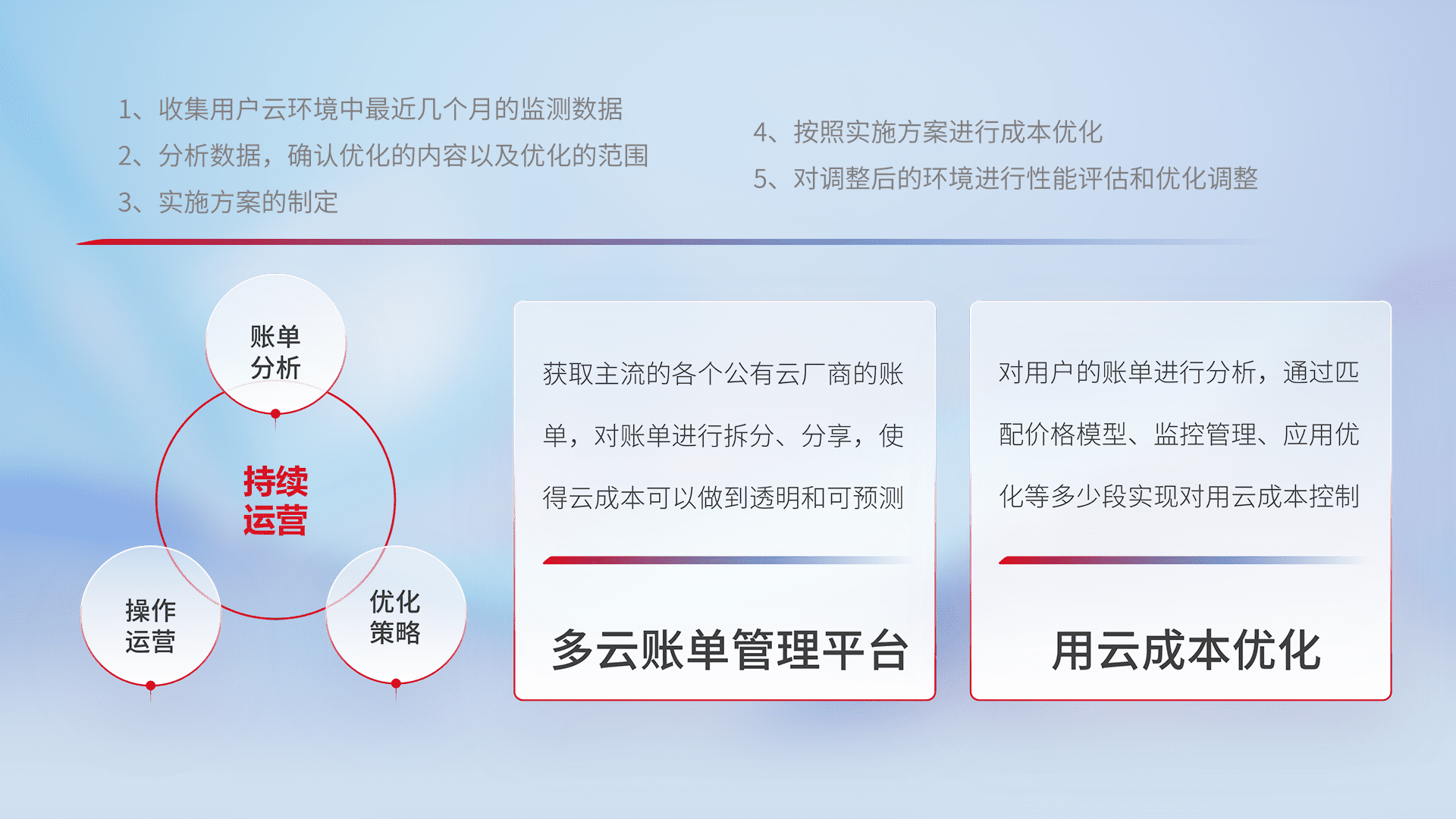 通过多云纳管,,,,以统一的资源数据模型把客户的云资源进行抽象和封装,,,,进而实现对多云资源的统一操作,,,保障云资源管理的可靠性、、、、稳定性与可用性。。。。量身定制化运维内容,,,配置、、、、开发运维、、、补丁管理、、备份、、、、监控、、认证和访问管理、、审计和日常巡检等,,,,保障在用云过程中的可靠度,,,稳定度以及高可用率。。。。